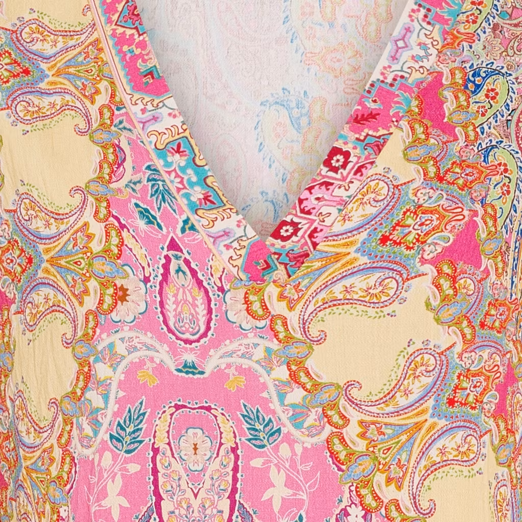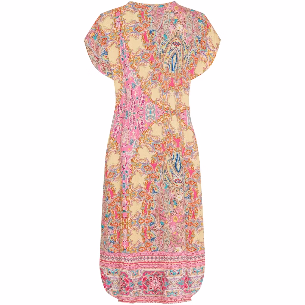 Fin sommarklänning i en härlig modell med v-ringning, fickor i sidsömmarna och som är lätt rundad nertill. En klänning att trivas i och som passar vid de flesta tillfällen.