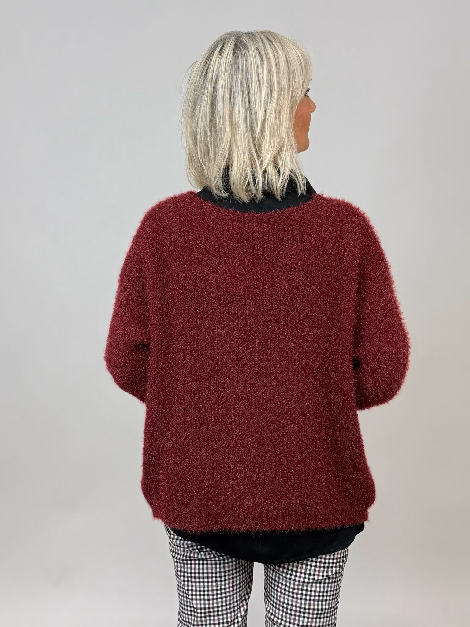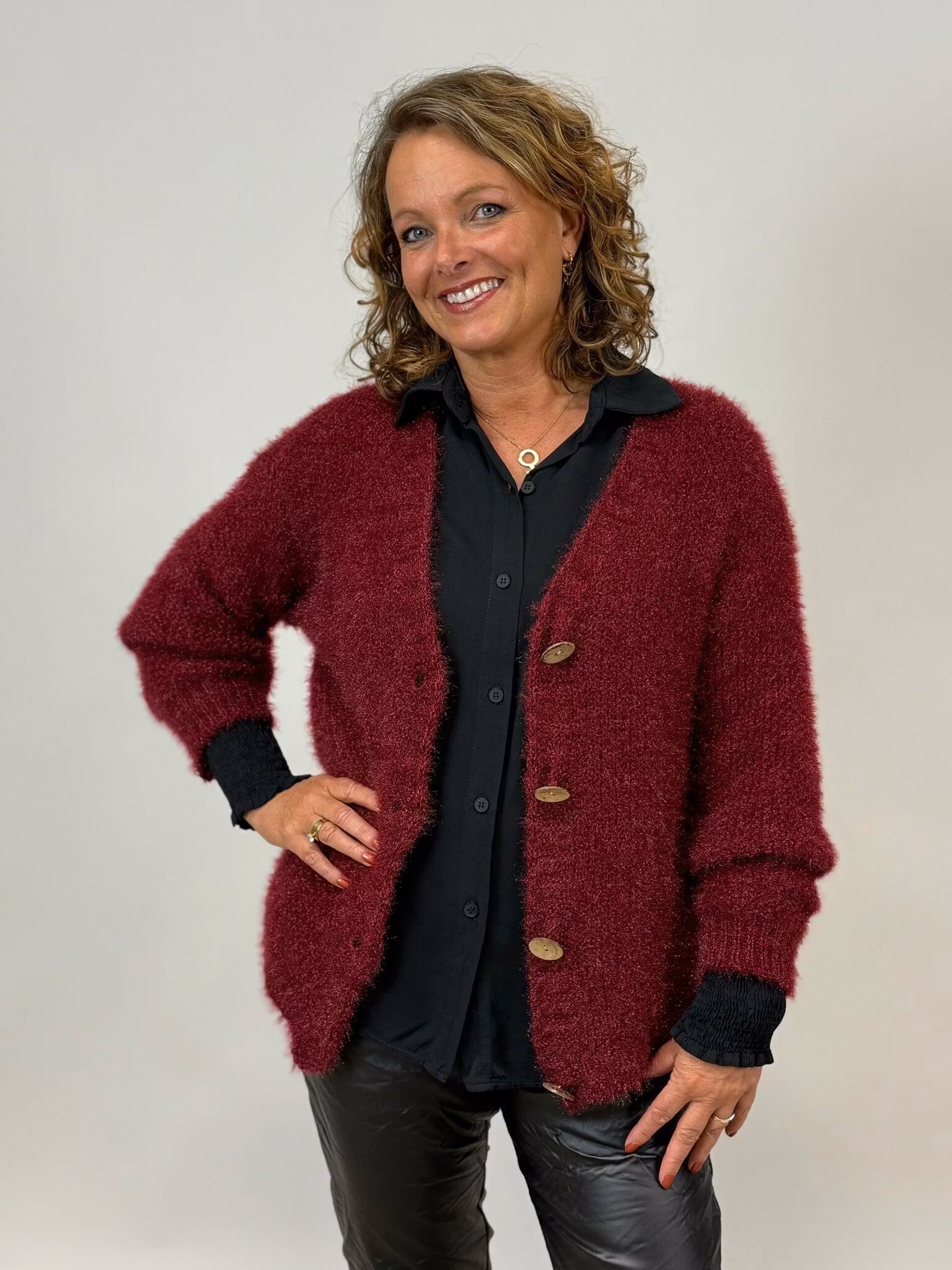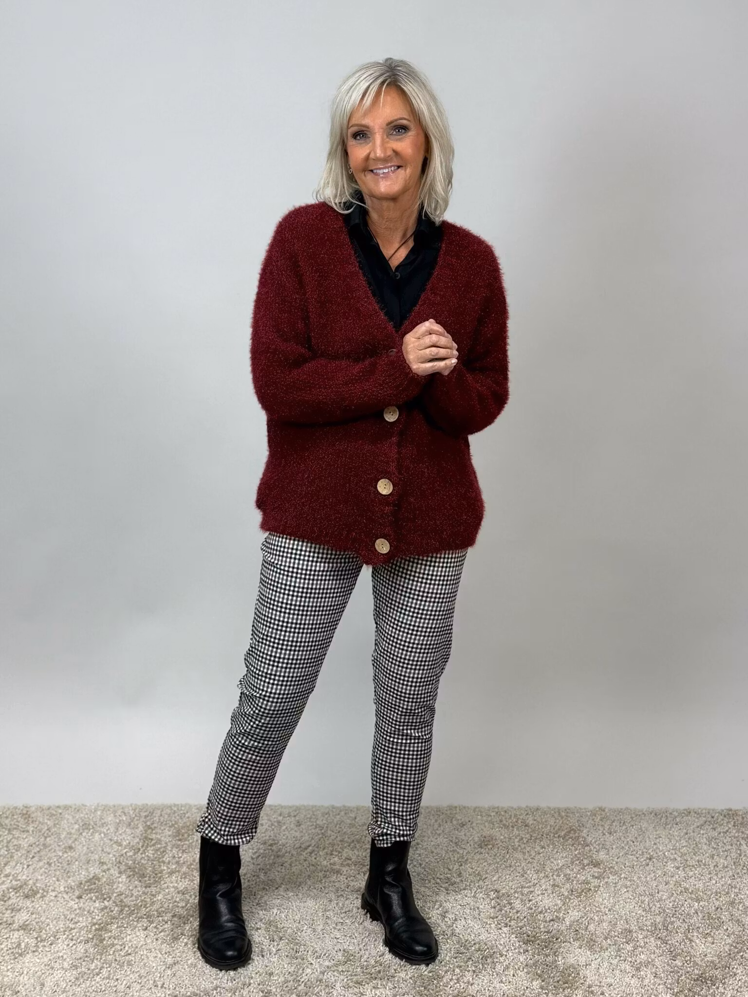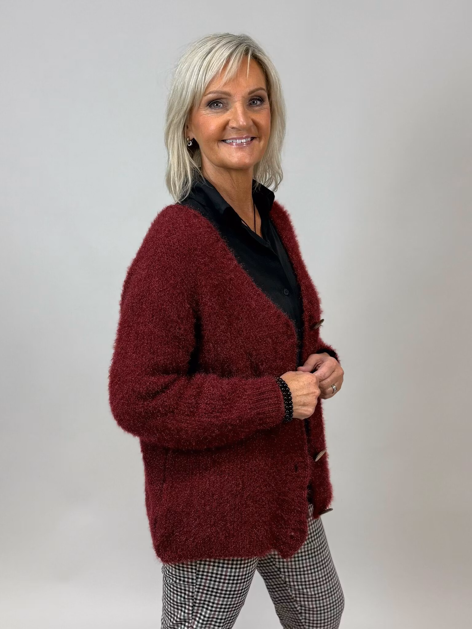 Koftan som är v-ringad har lång ärm och knäpps med fyra stora knappar. Garnet som är väldigt mjukt och skönt har en liten glans i tråden som ger plagget en fin lyster och gör den lätt att bära hela året till både byxor och över en klänning.