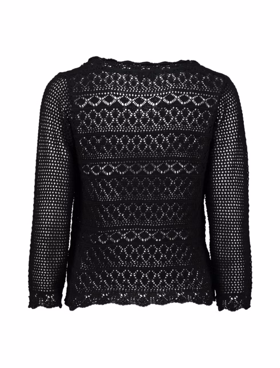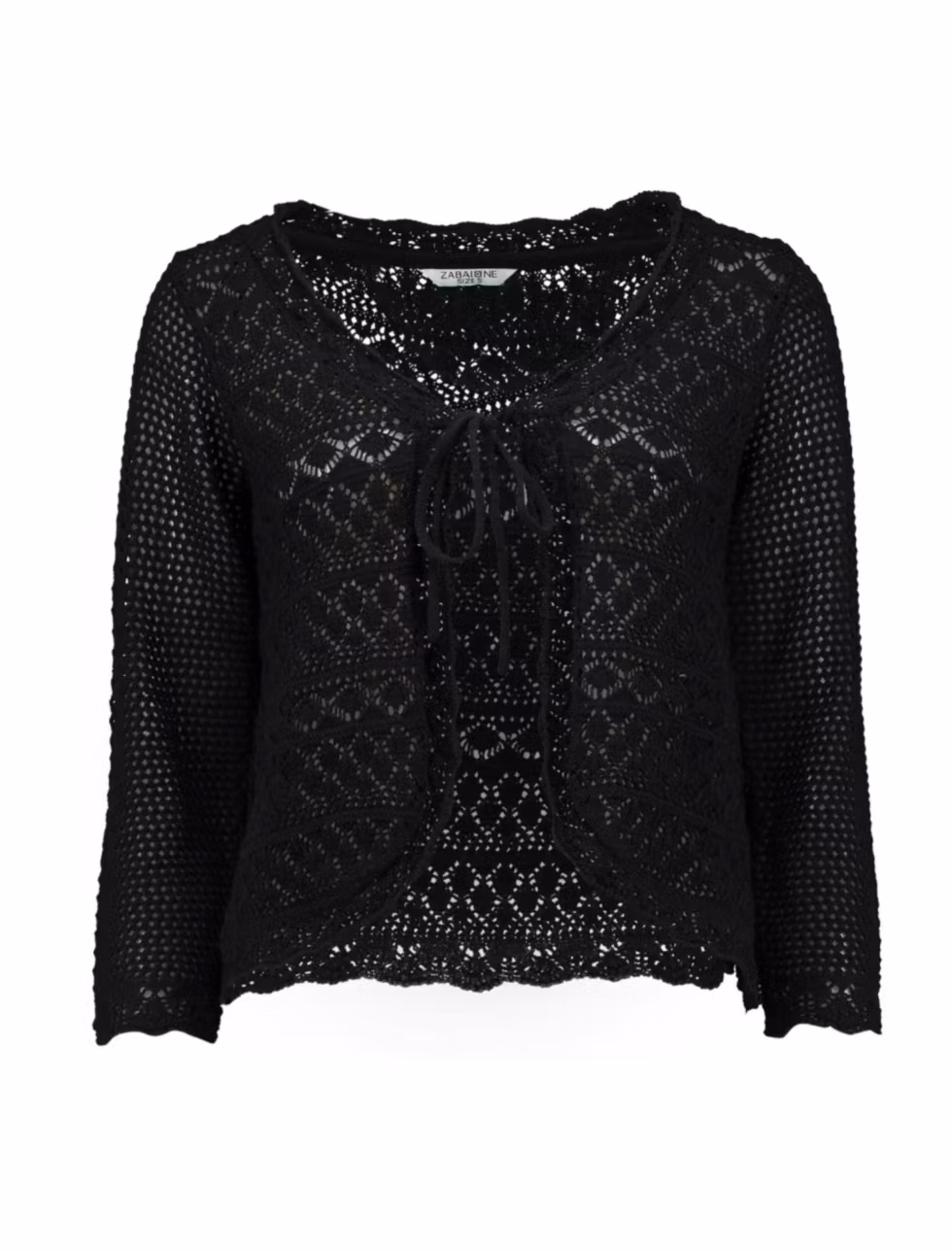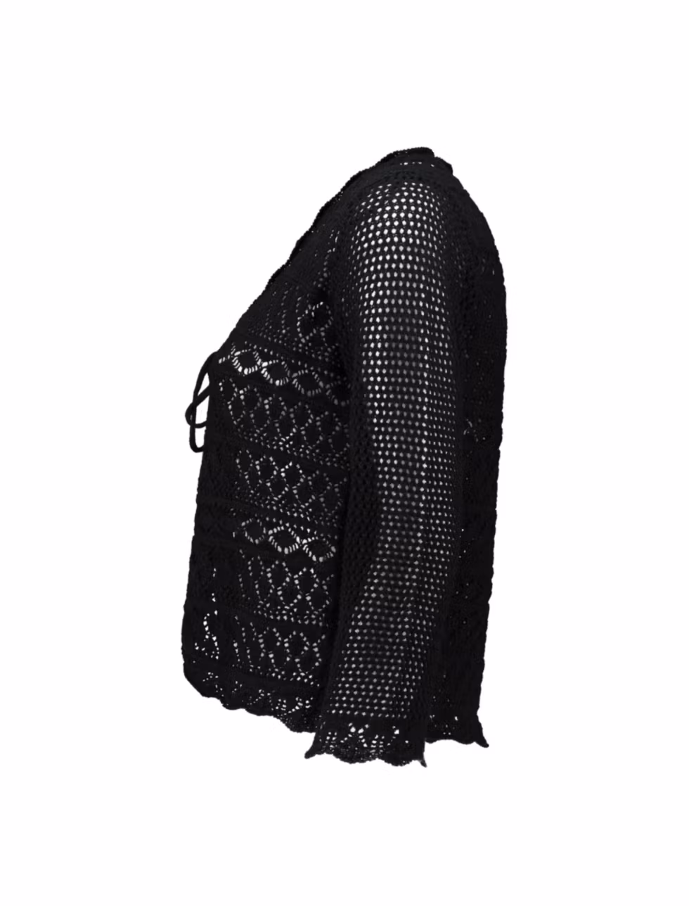 Fin, stickad kofta med hålmönster och vågad kant och 3/4 ärm.. Koftan har knytband fram vilket gör den lättburen även över en blus och modellen gör att den passa vid de flesta tillfällen.