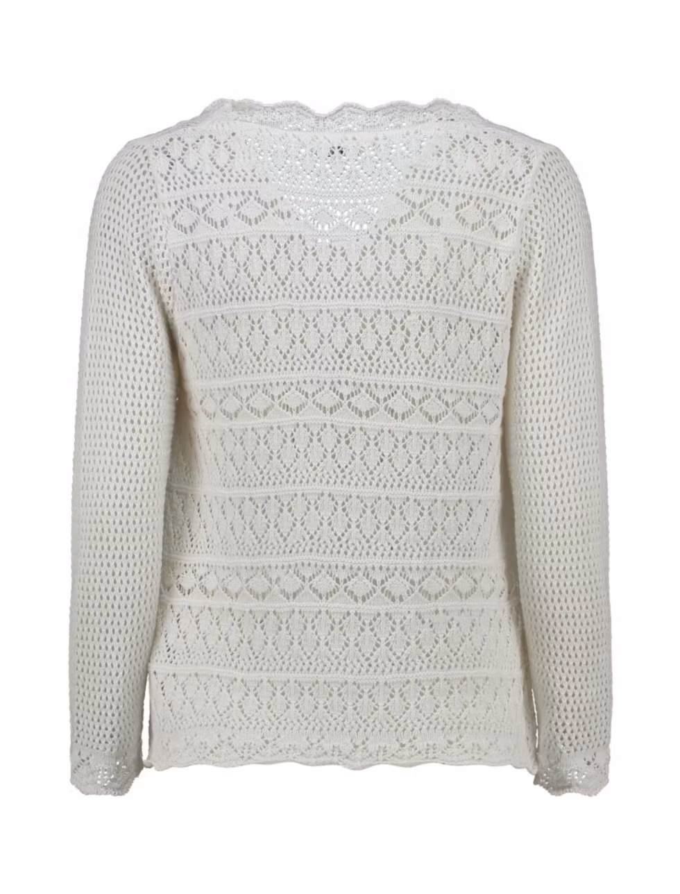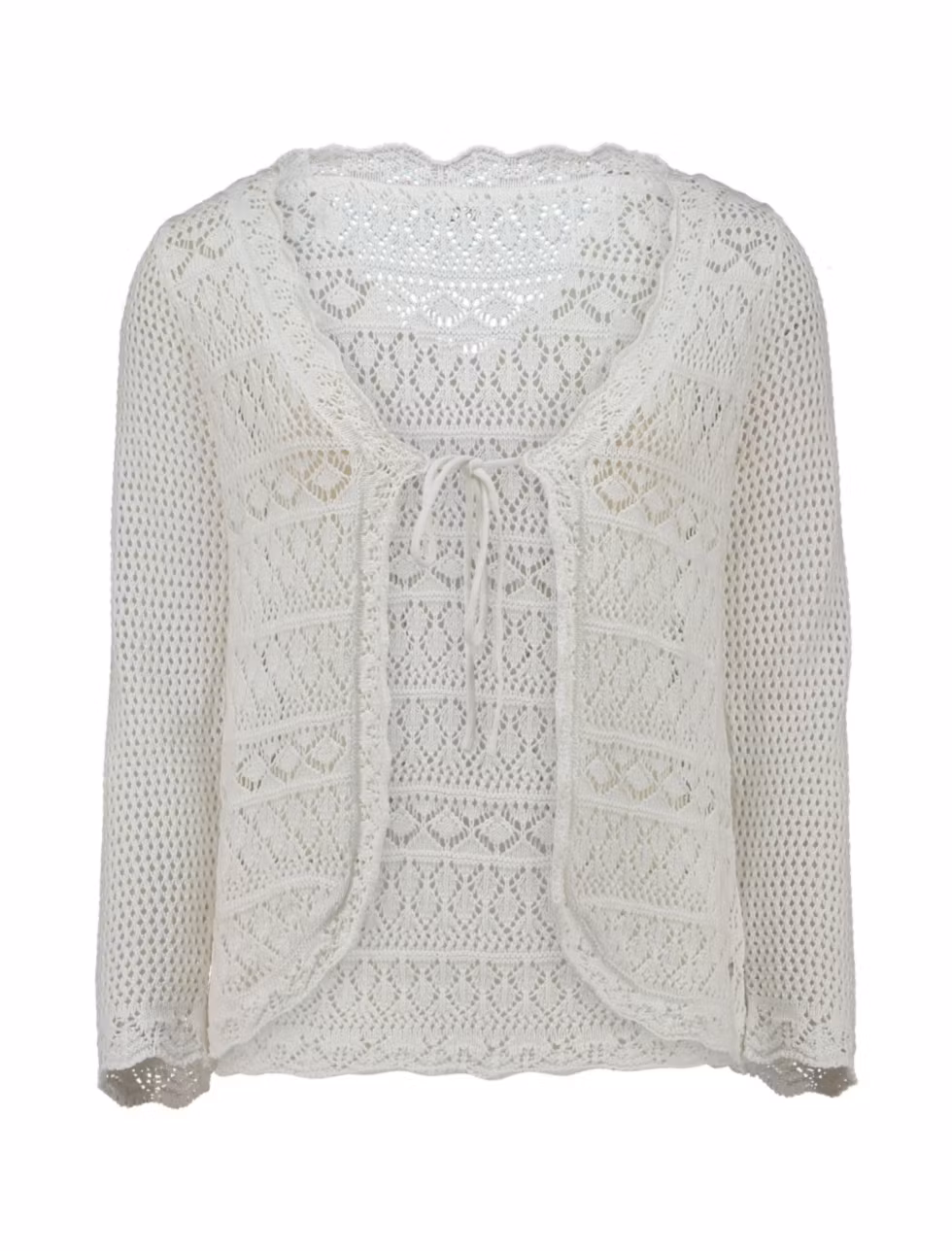 Fin, stickad kofta med hålmönster och vågad kant och 3/4 ärm.. Koftan har knytband fram vilket gör den lättburen även över en blus och modellen gör att den passa vid de flesta tillfällen.