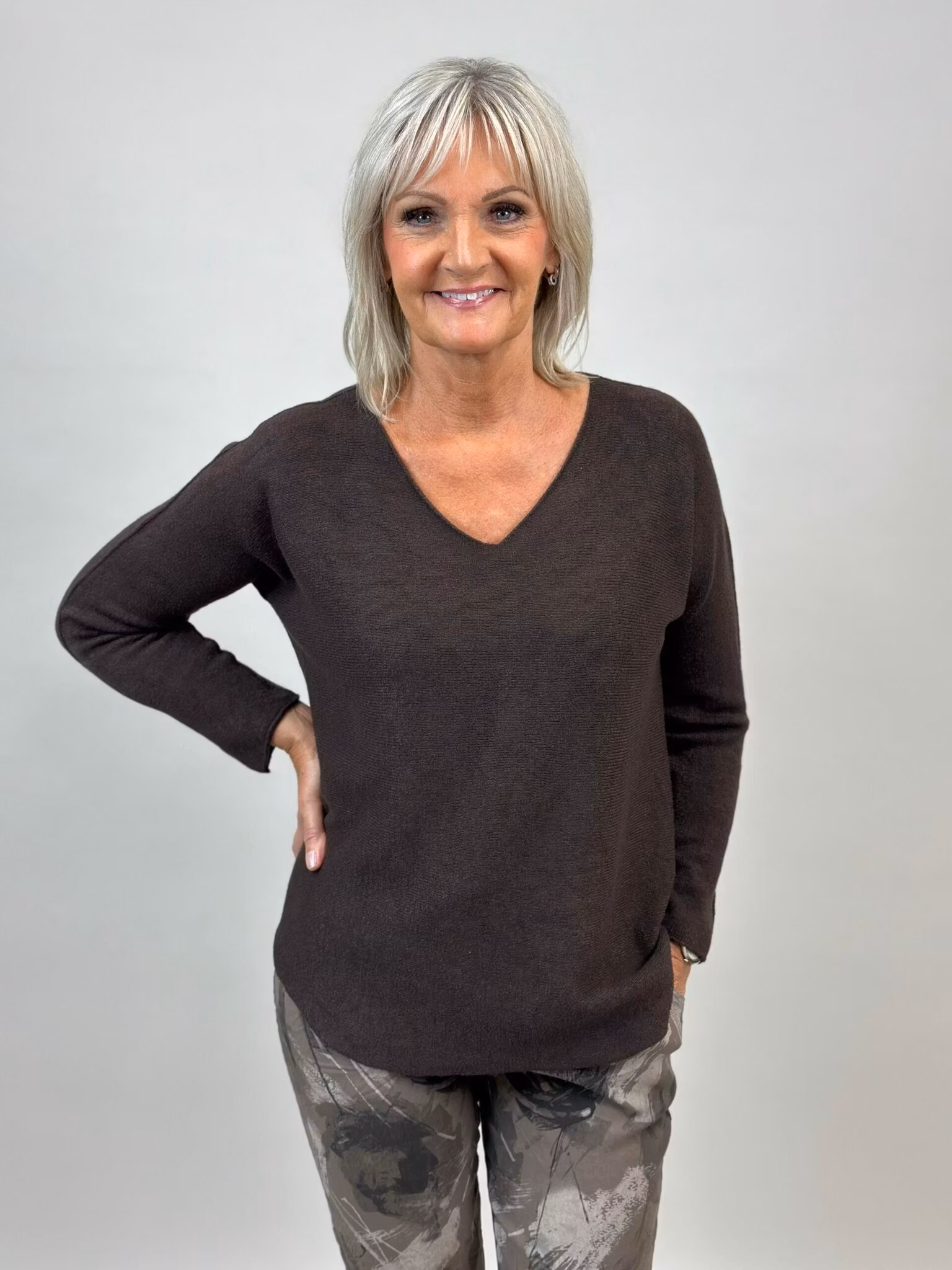 En väldigt mjuk och skön stickad tröja som är mycket omtyckt av våra kunder. Tröjan har v-ringning, lite rundad kant nertill, lång ärm, dekorativ rand längs ärmen.