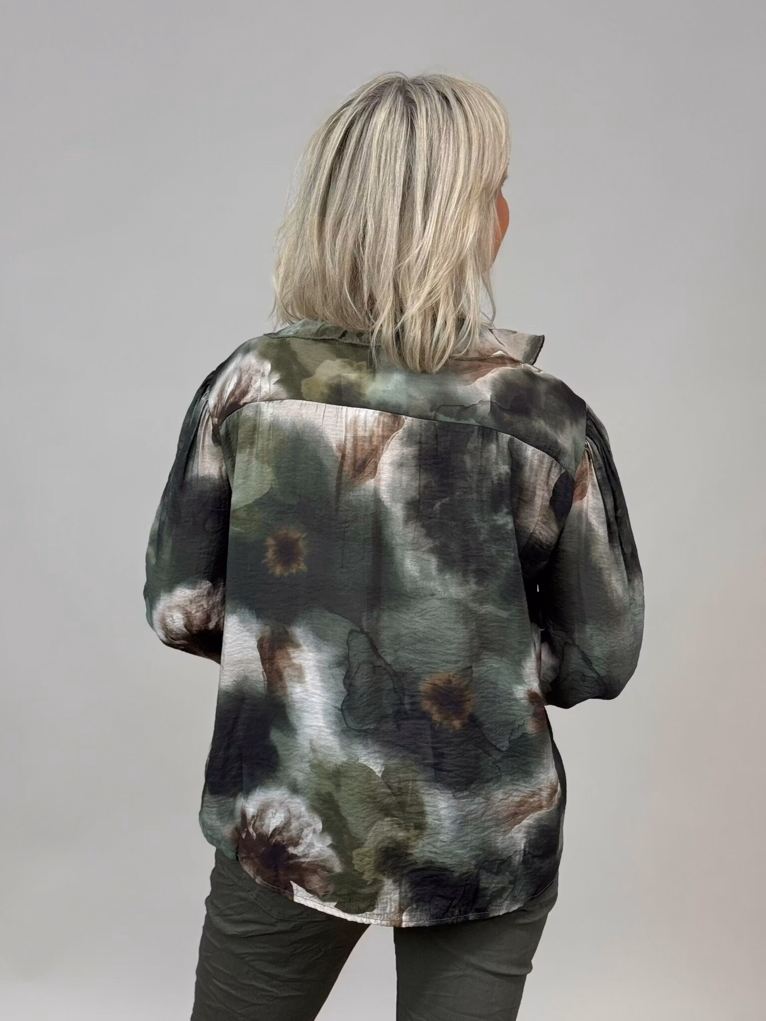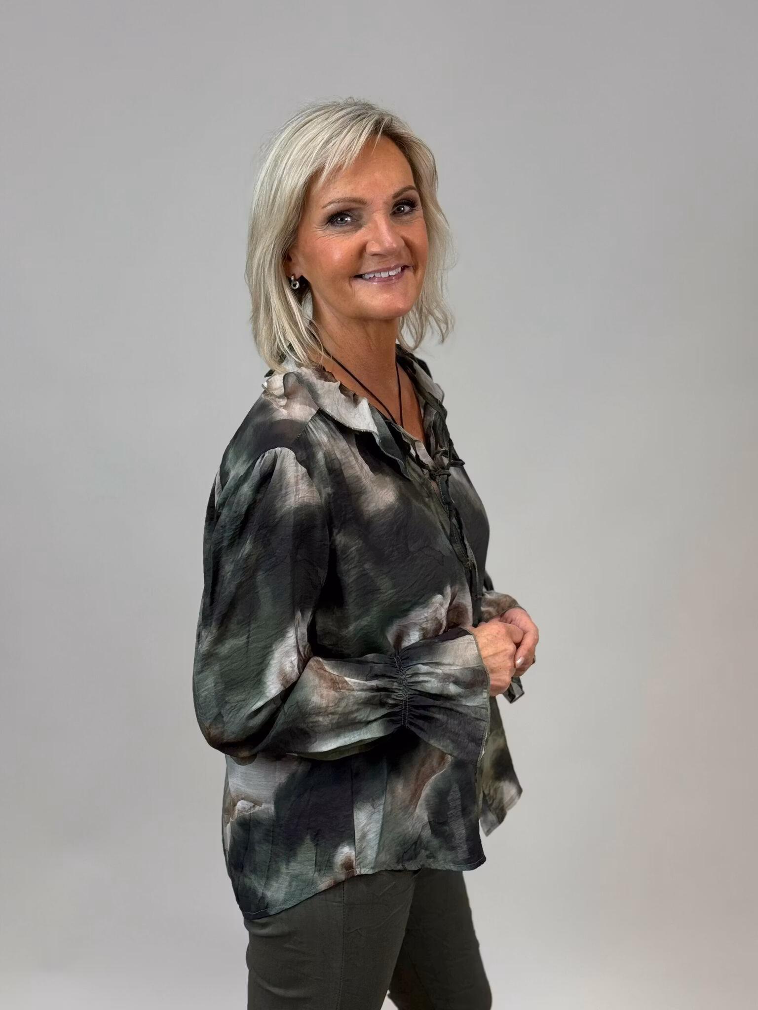 Snygg mönstrad blus med fin volangkrage och knyt fram. Blusen är genomknäppt och har även en volang och resår i ärmslutet.