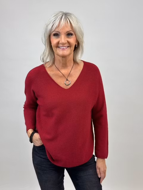 En väldigt mjuk och skön stickad tröja som är mycket omtyckt av våra kunder. Tröjan har v-ringning, lite rundad kant nertill, lång ärm, dekorativ rand längs ärmen.