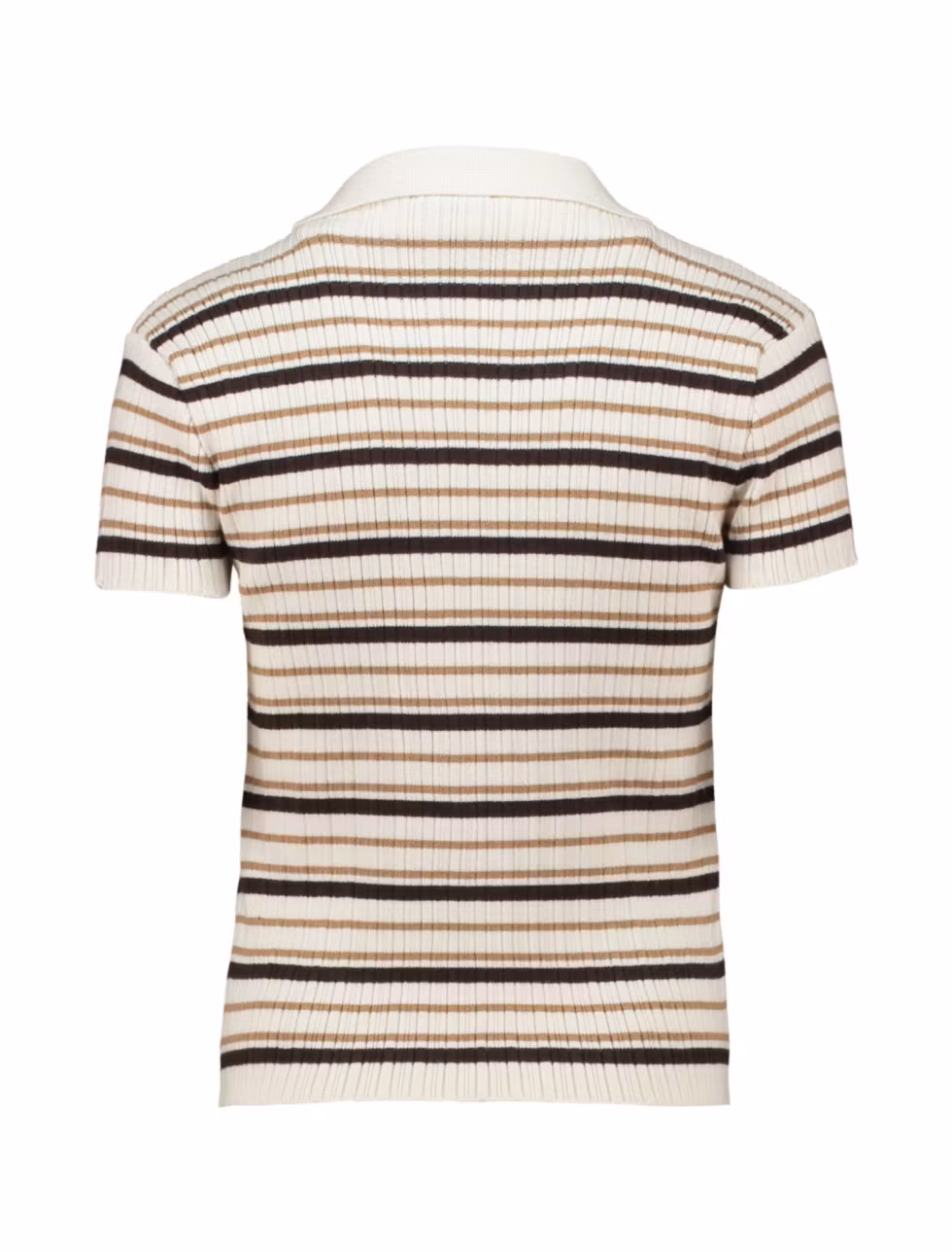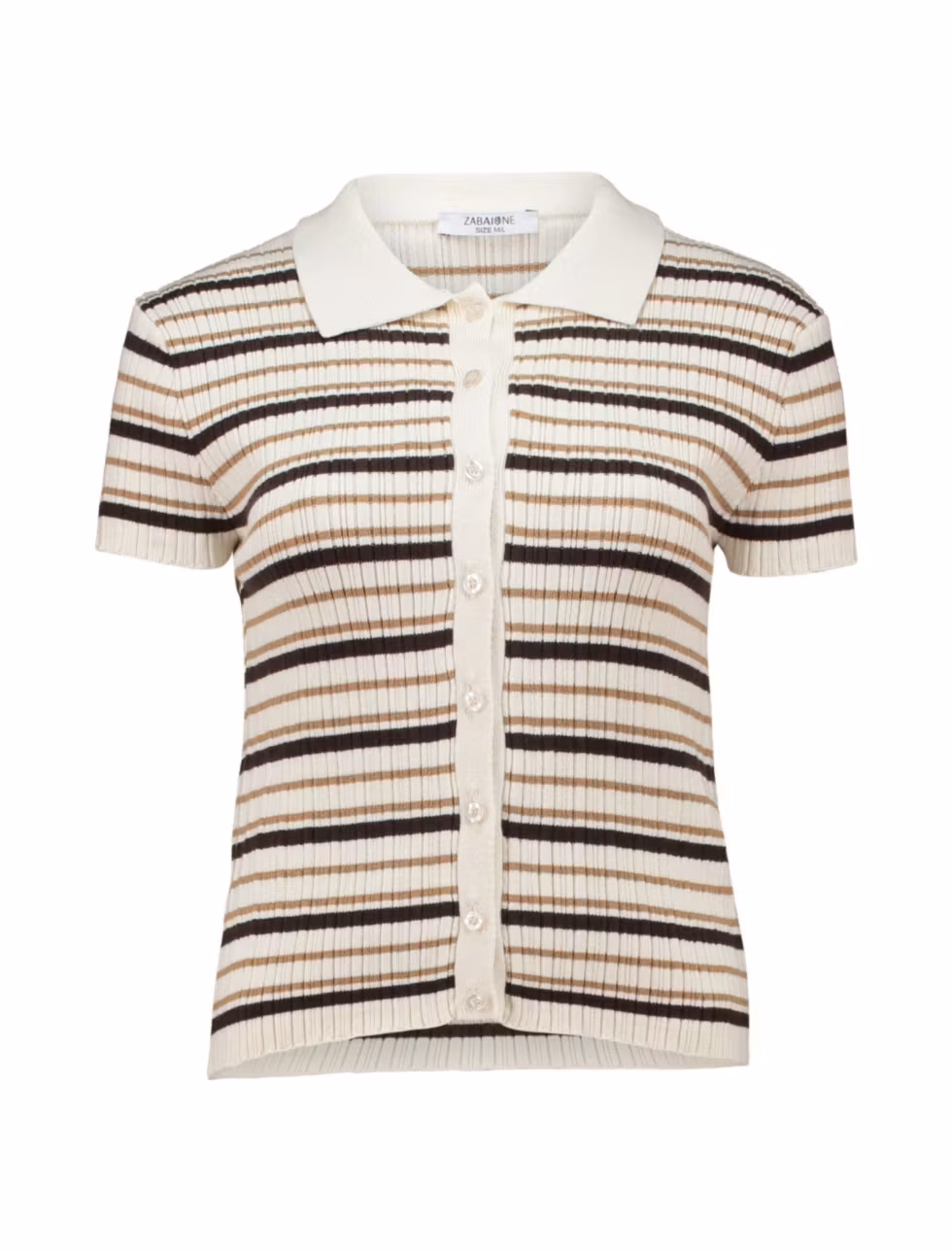 Skön, randig, ribbstickad tröja i blusmodell dvs den är genomknäppt och har krage. En tröja som är snygg till sommarens alla plagg.