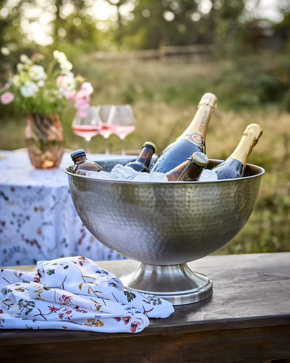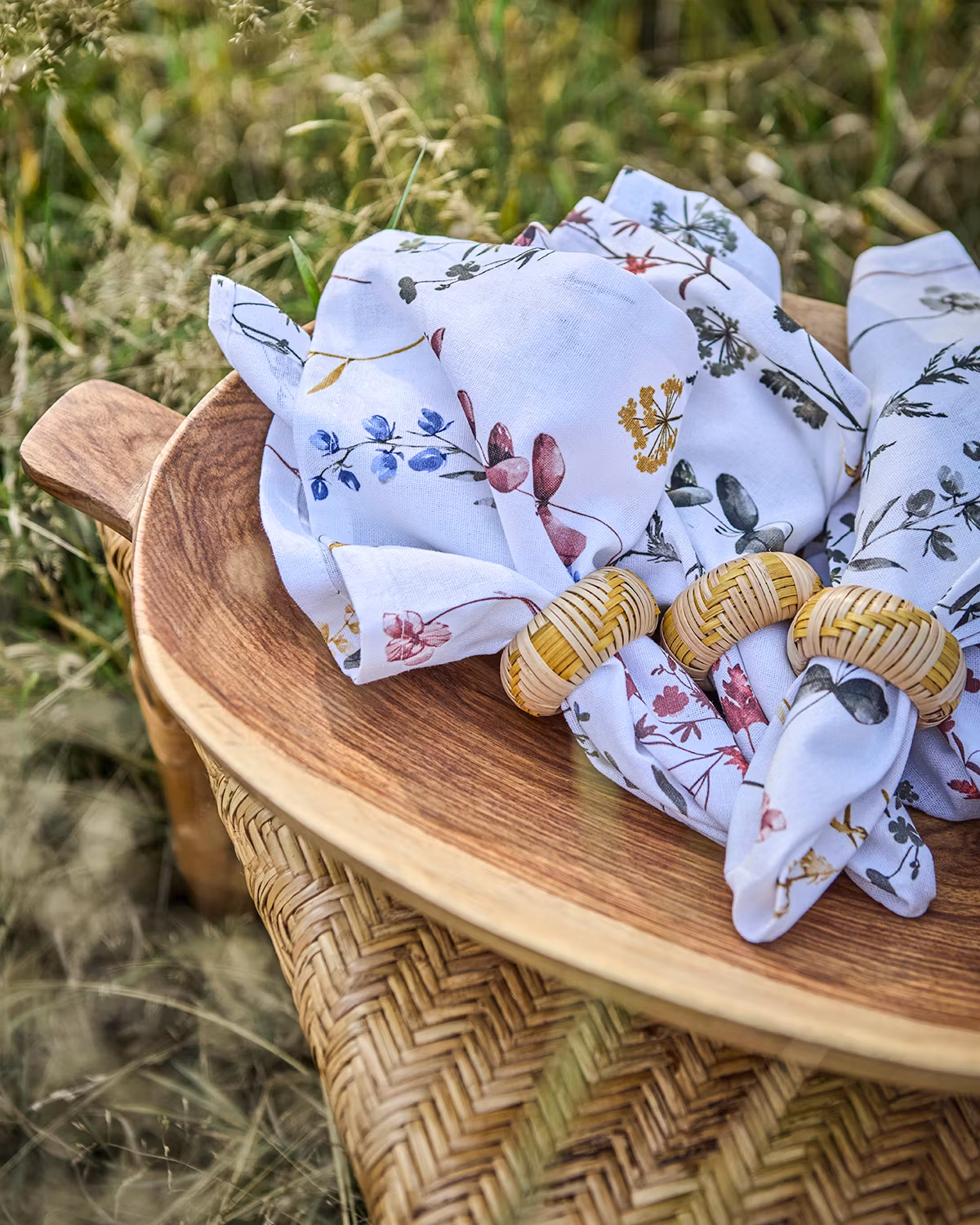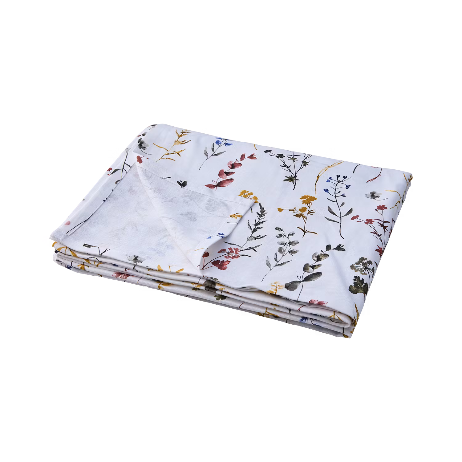 En fin, somrig servett eller duk till brödkorgen som förhöjer sommarens dukning med sitt mönster av blommor och blad i grönt, blått, mörkrosa, havregult på vit botten. Duken kommer från Affari of Sweden. Den sista bilden visar det fina mönstret men är en bild på den matchande duken.