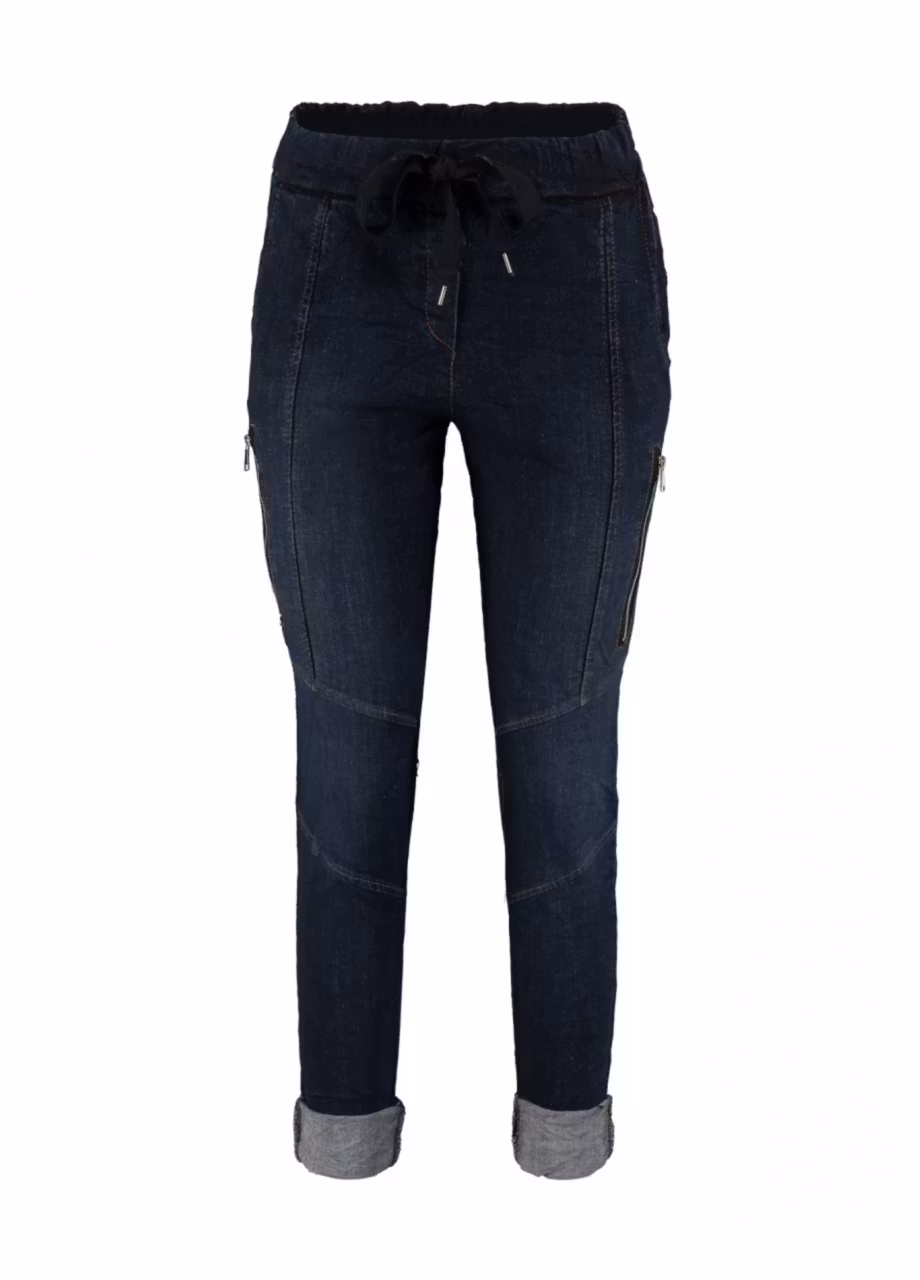 En otroligt skön byxa i mörk denim med skön stretch, fuskgylf, fickor både fram och bak och dekorativa sömmar och fuskfickor med dragkedja på benen. Midjan är lite högre och har både resår och dragsko.