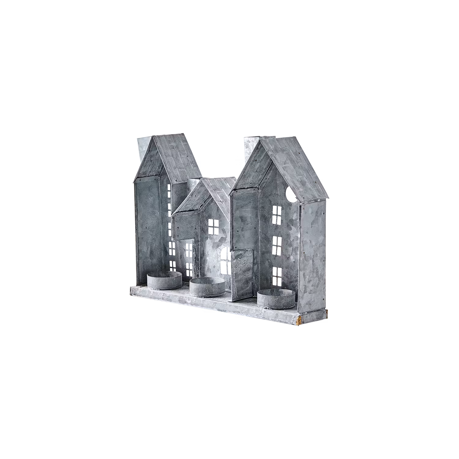 Ljuslykta hus 299 kr I lager. Lägg i korgen Produktbeskrivning Ljushållare i form av tre hus på rad Material: metallFärgnyans: Grå/vitØ3,8 cm värmeljus.